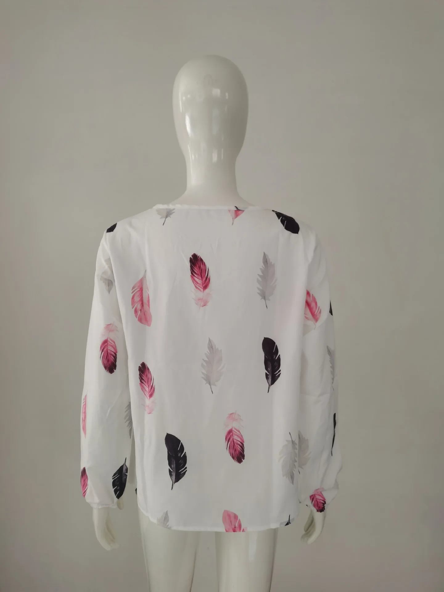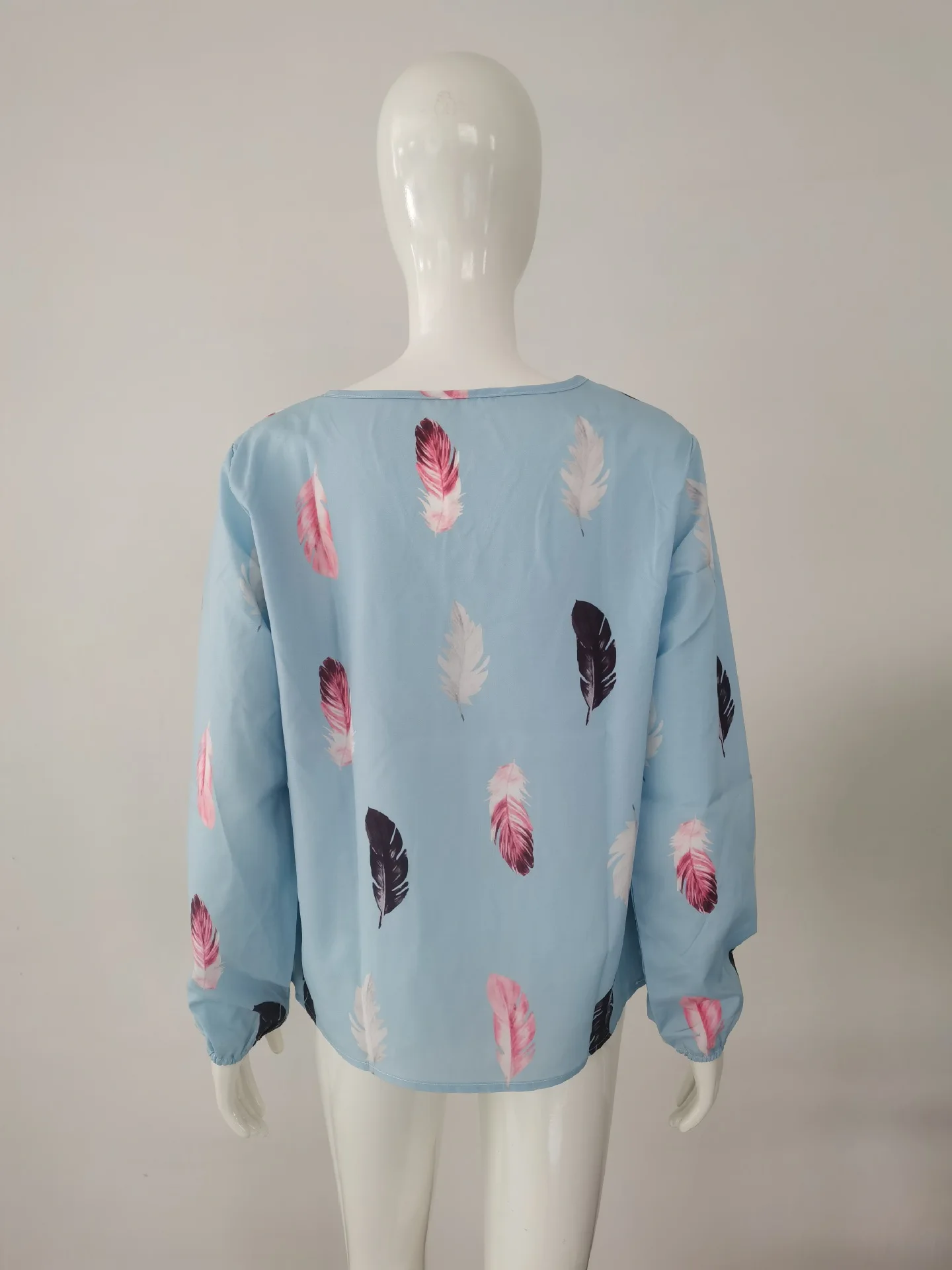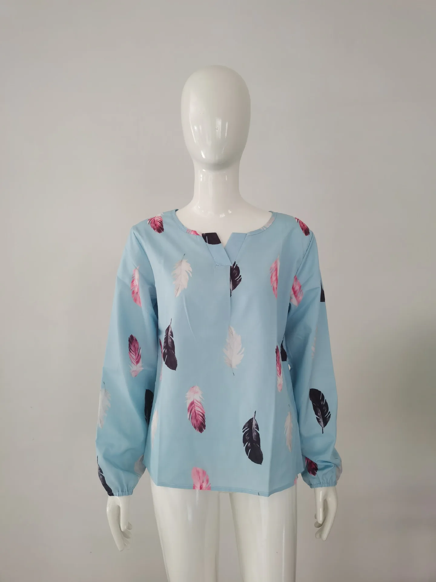 Temperament Elegant V-neck Feather Painting Printing Long Sleeve Loose T-shirt Flare Sleeve Women's Tops